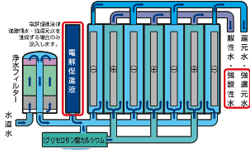 The negative electrode produces active hydrogen water, which contains large quantities of active hydrogen and has strong reducing or anti-oxidant properties. We call this kangen water; it has a pH of 8.5-9.5. The active hydrogen in kangen water reacts with the active oxygen in the body to produce harmless water. Thus, kangen water is very beneficial to bodily health; it has smaller clusters which can be more easily absorbed by our body.