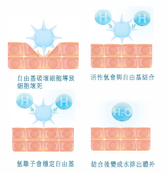 Active hydrogen bonds with active oxygen to form harmless water molecules. Water that contains large amounts of active hydrogen is known as ionized water.