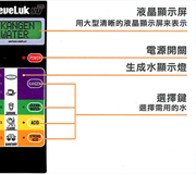 一個清晰、大型顯示屏及發聲裝置,能告知你現正使用那一種水,即包括還原水、淨水、弱酸水、強酸水*、強還原水及其他告示式資訊。 於使用上,五個不同的按鈕整齊地由上而下排序,你想要那一種類型的水,只需輕鬆一按便可製造出來,操作易如反掌。 *當你選擇按強酸水按鈕時,灰色的出水軟管會製造強酸水,而白色的出水軟管會製造強還原水。