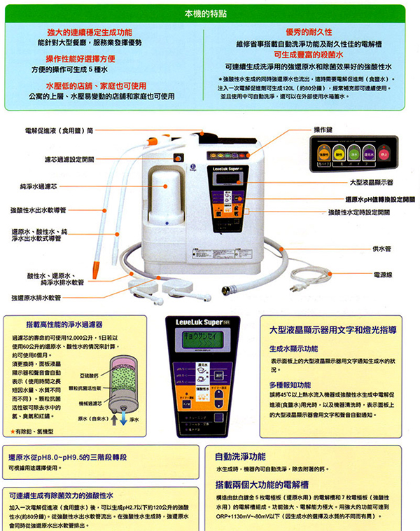 業內唯一一台無需使用電解液便能製造大量的強還原水及強酸性水,而且時間極短便能盛載。例如需要 120 公升的強酸水,只需要80分鐘便可以製造出來。